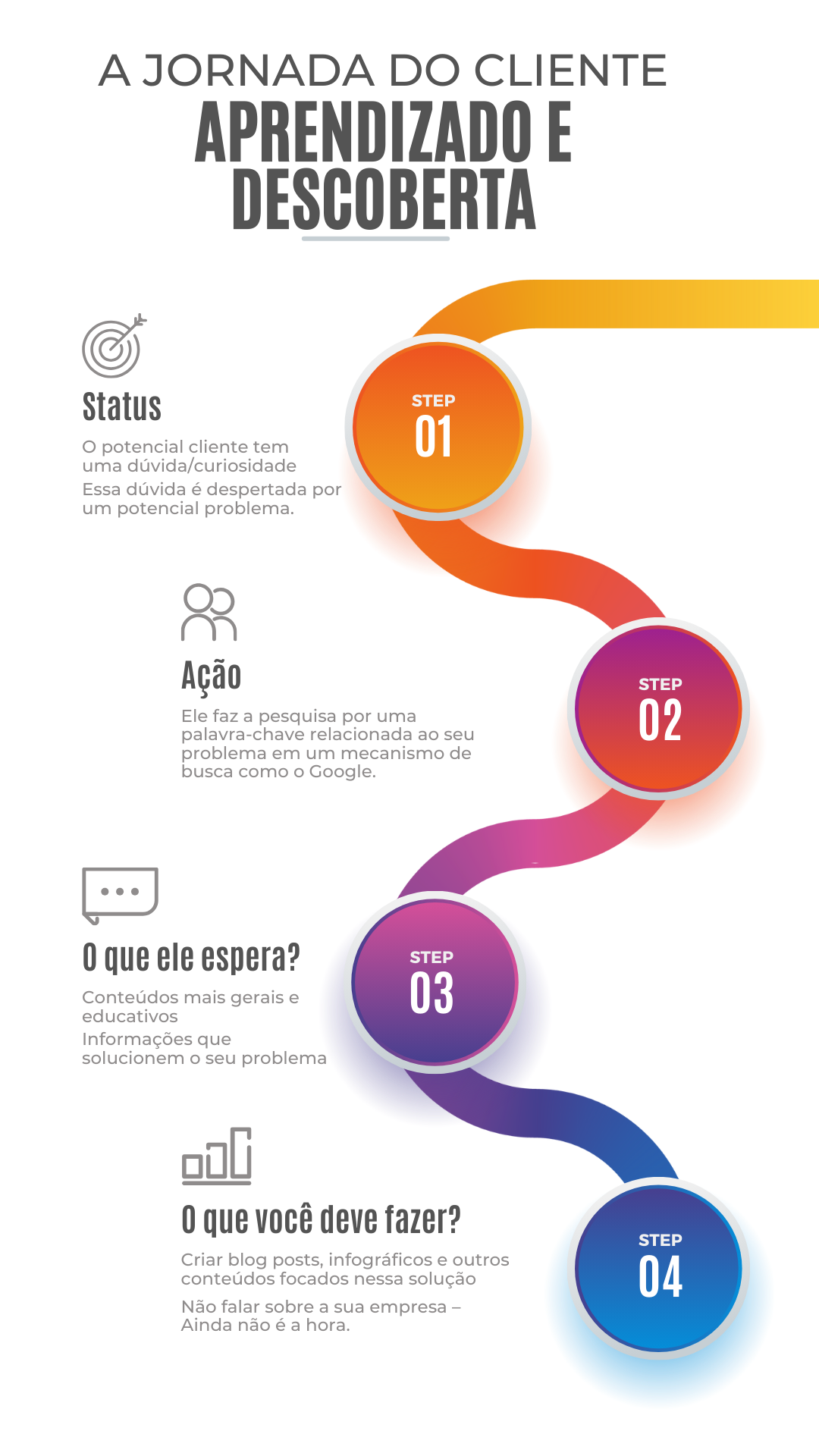 Na primeira fase da jornada, seu potencial cliente, muitas vezes, desconhece o problema que tem e, por isso, é improvável que ele busque por soluções nesse momento. Por outro lado, essa pessoa pode ter alguma pista do que precisa ou passou a sentir uma determinada necessidade que a motiva a buscar por informações.