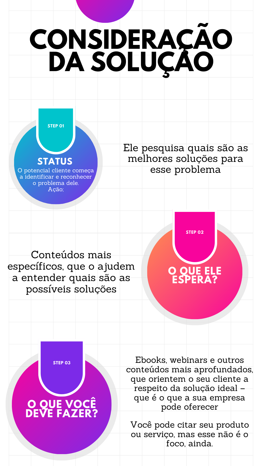 • consideração da solução: seus potenciais clientes já estão cientes do problema e passam a buscar aprofundamentos e soluções;