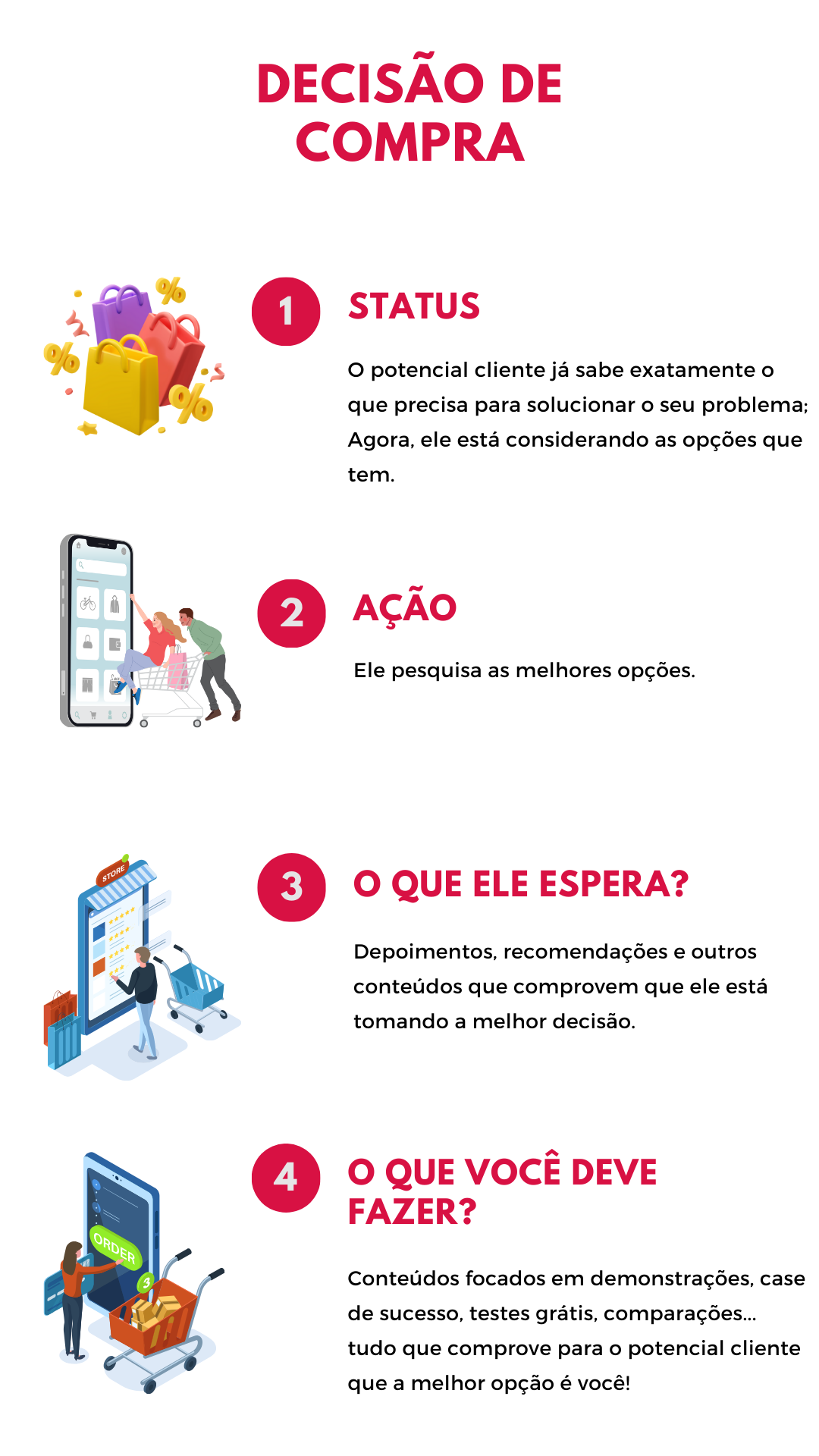 • decisão de compra: seus potenciais clientes estão analisando as soluções disponíveis e muitos tornam-se oportunidades de venda;