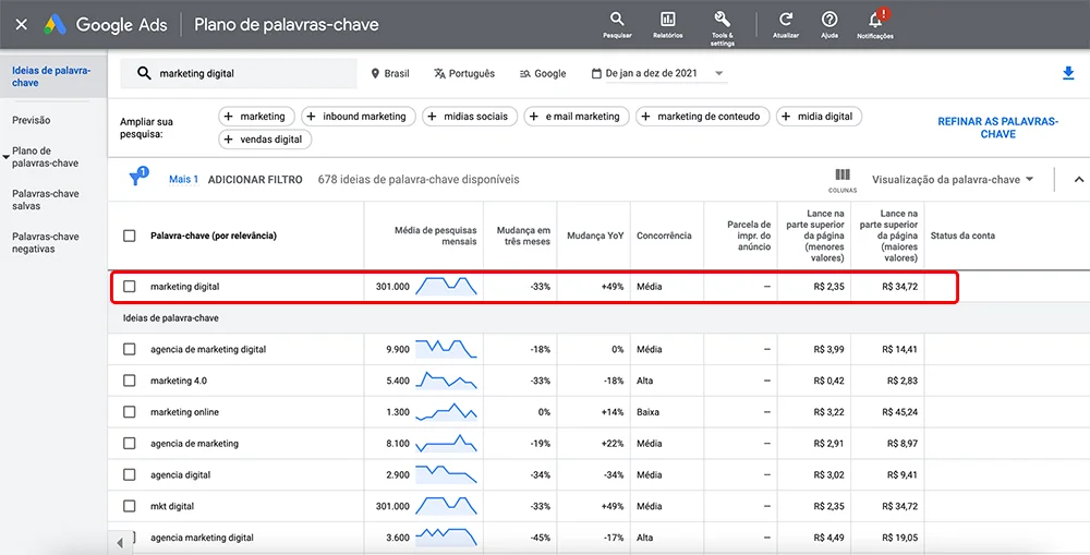 O primeiro passo antes de tudo, é fazer um bom estudo de palavras-chaves, para isso, você pode usar o planejador de palavras do próprio Google Ads para te auxiliar.