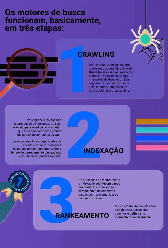 Motores de busca são sistemas formados por uma série de algoritmos que têm a função de rastrear, indexar e rankear os conteúdos da web para exibi-los de maneira ordenada nas pesquisas dos usuários.
